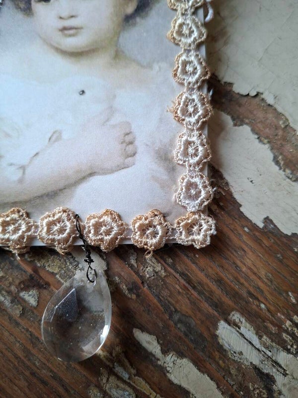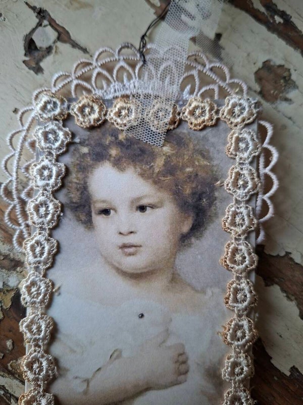 Mooi oudgemaakt label van papier en kant.